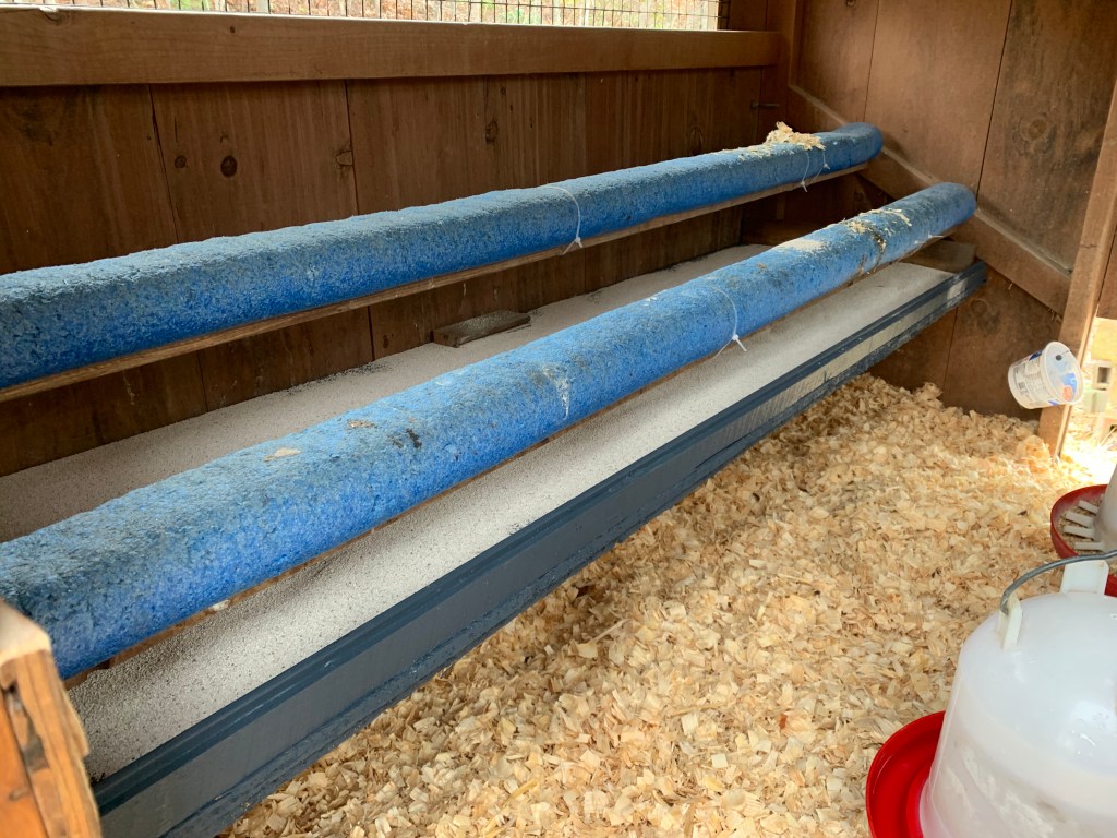 Poop boards were made with molded aluminum and are now lined with dried coffee grounds (not pictured). Roosts were trees from the backyard. Not sure how the girls feel about them just yet. Their old roosts were 2x4s with the skinny side up, and wrapped with pool noodles.