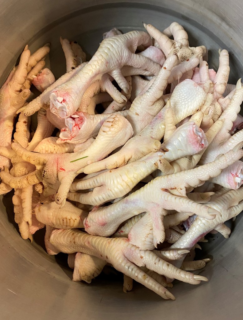Chicken feet are dirty. In order to use them you must first peel the feet. Yes, you read that correctly. I said peel them. Just like you blanch the body to lose the feathers for removal, you most also blanch the feet. Simply boil them in water for about 15 seconds, dunk them in ice water, and the skin will be loose enough to peel. This is a tedious task. It took me a total of about three hours to boil and peel feet, which I did over the course of three days.