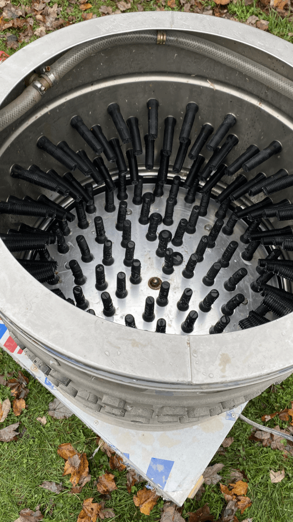 After scalding, the birds went into the plucker, two at a time. It was incredible. The drum would spin while a water hose was attached and running. The water washed out the feathers as they were getting plucked. They were naked in a minute or less.