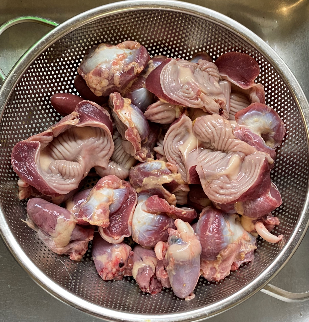 After plucking, it was time for gutting. We had to remove the head and feet first. We kept the feet and tossed the head. Next we had to cut open the abdomen near the vent (butthole for lack of a better term), and begin removing the organs. The intestines took up roughly 1/3 of the abdominal cavity. The kidneys were maybe the size of a quarter or a little larger, the gall bladder the size of a nickel, the lungs were the size of a dollar folded into 1/4ths. We discarded all of those organs. We kept the heart, liver, and gizzard. The gizzard is like the chicken’s stomach. The chicken will eat small pebbles which sit in the gizzard. The gizzard itself is a powerful muscle which contracts, squeezing the pebbles, and subsequently grinds the food. While I don’t have imagines of peeling the gizzard, that was something I learned: you have to peel the gizzard. As an aside, we live in coal country and nearly all of the “pebbles” in these birds’ gizzards were lumps of coal!