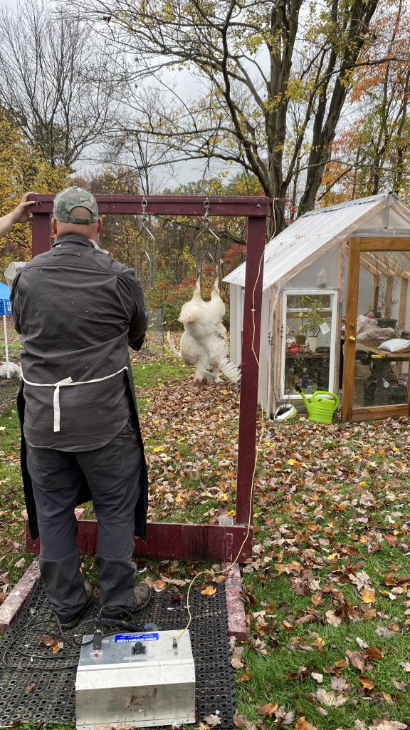 Unfortunately in terms of experience, my neighbor butchered all of them for me, but I stood by for the first four birds and felt only a little emotion over their death. This was their intended purpose. He first stunned them, then cut the carotid artery and the jugular, keeping the esophagus intact. He said this keeps the carcass cleaner overall when scalding and plucking them, and draining the blood immediately helps to maintain a higher quality of meat. The birds flapped and struggled for a minute, and it was all over.