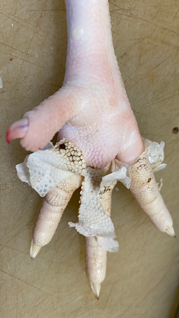 Last month I wrote about raising and processing Cornish meat chickens, and I promised I would talk about how to prepare and use the chicken feet for homemade stock. You may find chicken feet at some Asian markets, and most likely they will already be prepared and ready for immediate use. If you are like me and got your feet from processing chickens, you will need to prepare them.